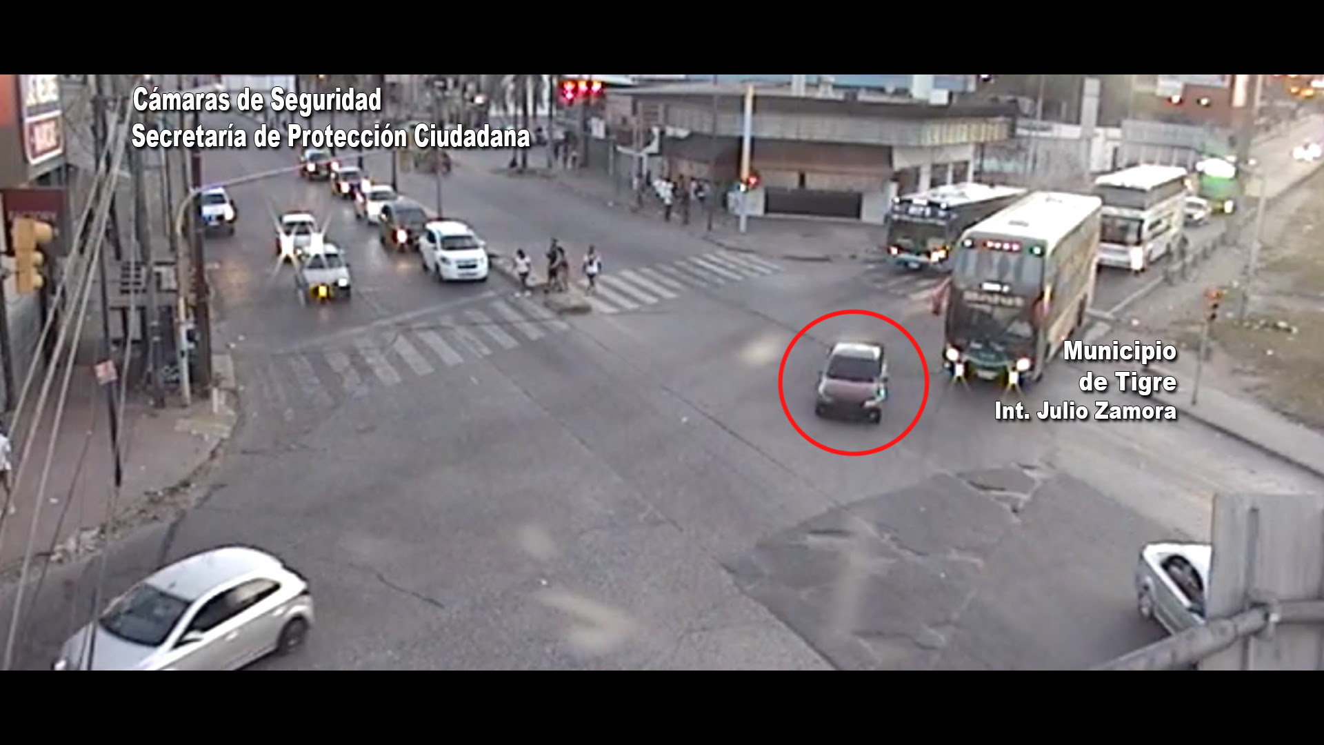 Las imágenes muestran, en un primer momento, al rodado cuando circulaba por Colectora de Panamericana: allí se puede ver al conductor realizar maniobras imprudentes. Al instante, se lo ve cuando cruza en rojo el semáforo emplazado en Ruta 197 y Colectora. El micro que venía por esta última arteria, lo impacta de costado.